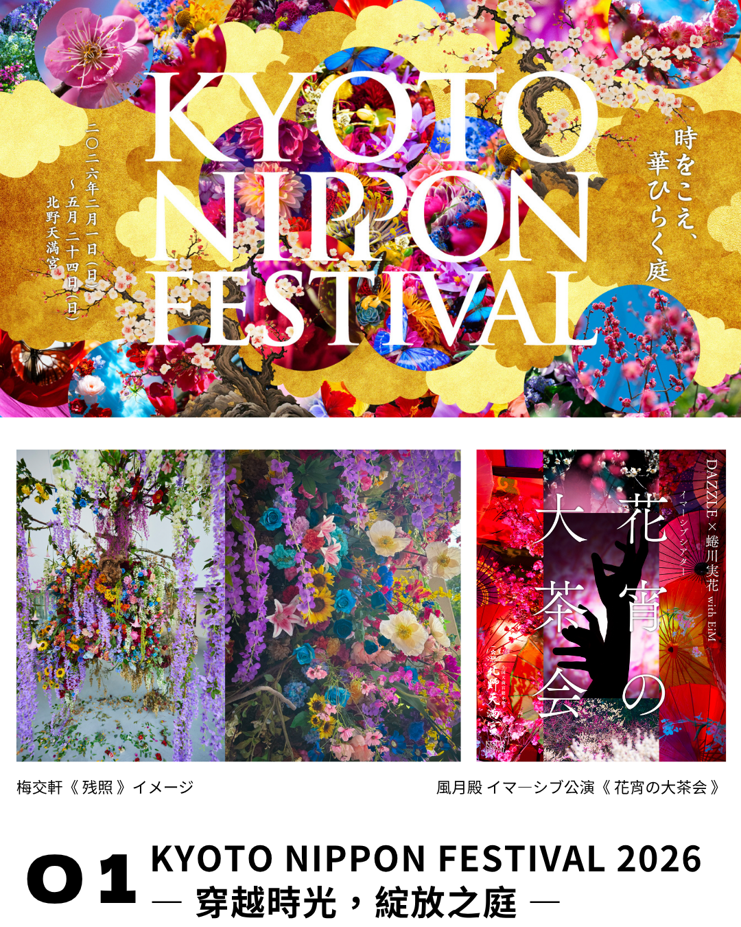 北野天満宮の梅苑や茶室を舞台に、蜷川実花 with EiMのインスタレーションとDAZZLEによる日本初の歴史的建築でのイマーシブ公演を展開。豊臣秀吉の伝説の茶会“幻の二日目”をテーマに、空間・美術・身体表現が交差する没入体験を創出。梅の開花から新緑へと移ろう季節の美も堪能できます。