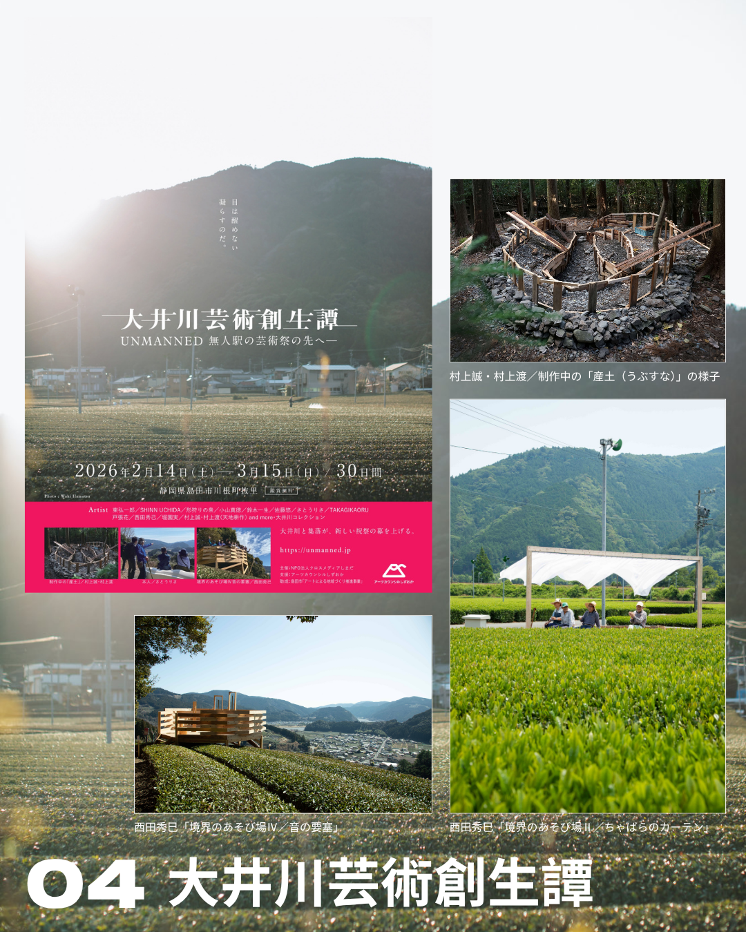 延續「UNMANNED 無人車站藝術祭/大井川」活動,以無人車站與大井川沿線為舞台,約10組藝術家參展,透過作品與影像構成的「大井川收藏」,回望藝術祭與在地共同累積的歷程。