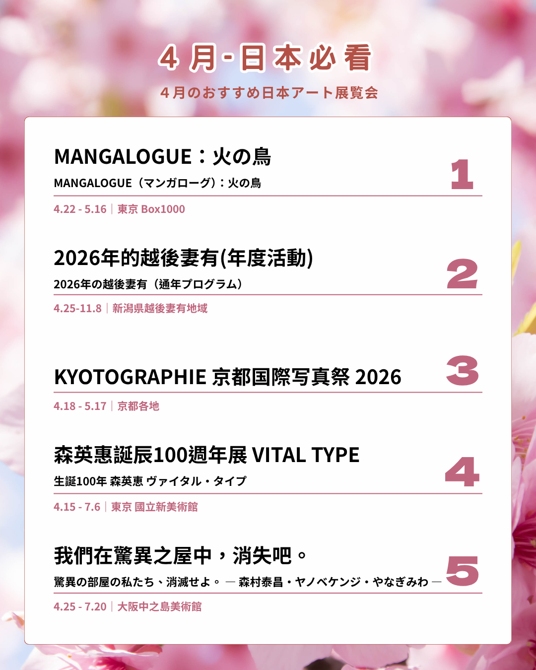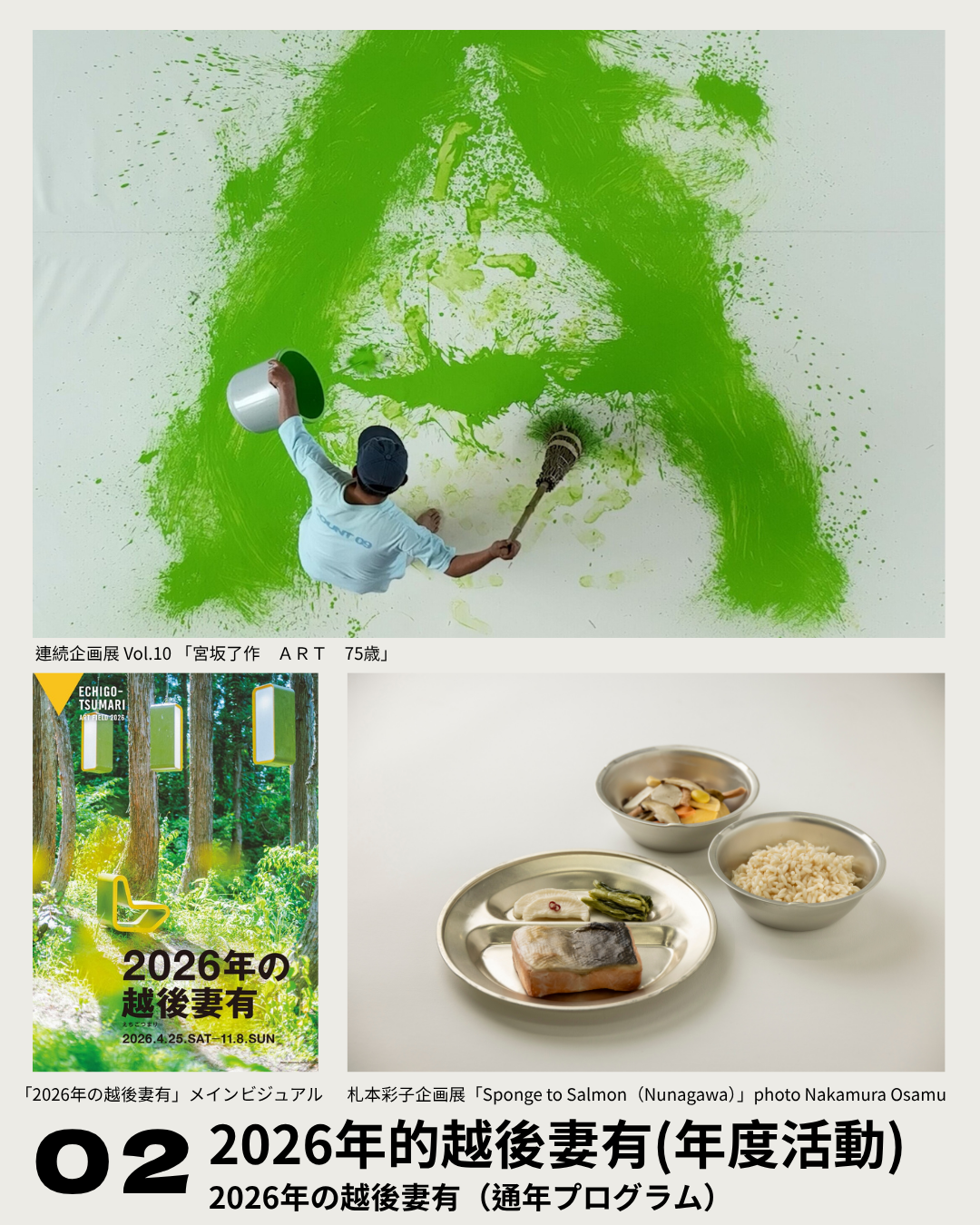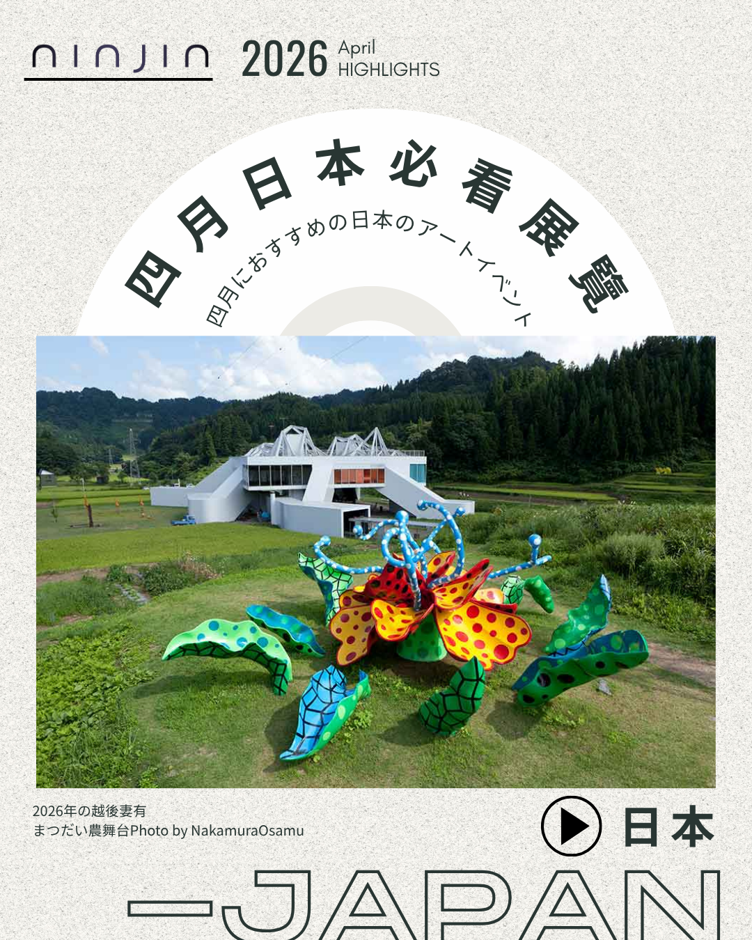 新潟県の越後妻有で2000年から続く「大地の芸術祭」は世界的にも地域芸術祭の先駆けです。2026年の春会期は、MonET企画展Vol.10 「宮坂了作 ART 75歳」、絵本と木の実の美術館の春夏企画展「スズキコージ ネンドキャラバン」、農業を舞台にし山菜散策散歩などのイベントを開催。有名な常設作品だけでなく、限定開放や公式アートバスにも乗車可能。山の中でアートを巡ろう!
