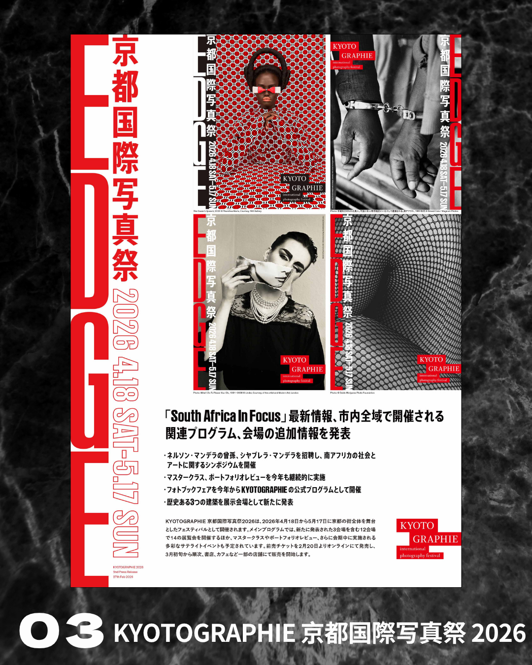 京都国際写真祭は、寺社や町家を舞台にした体験型写真祭。今年は「EDGE」をテーマに、森山大道ら14組が12会場で展示。写真を通じ、社会の「際」や歴史、建築の魅力に触れます。
