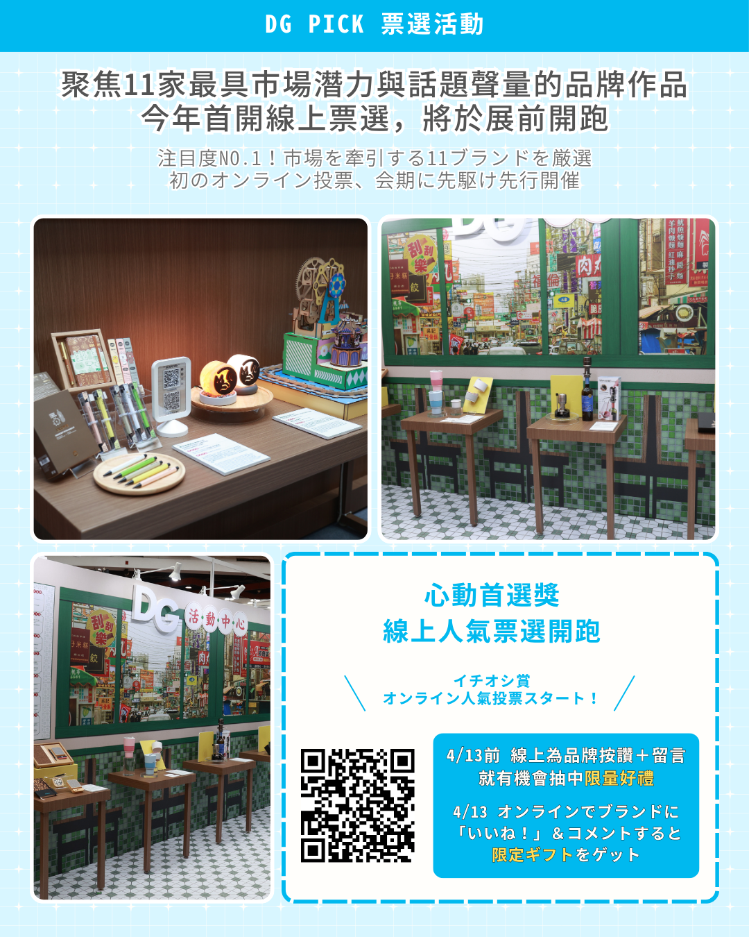 DG年度の指標となる人気投票。市場ポテンシャルと話題性の高い11社が参加します。今年は展示会に先駆け、初の「オンライン投票」もスタート!