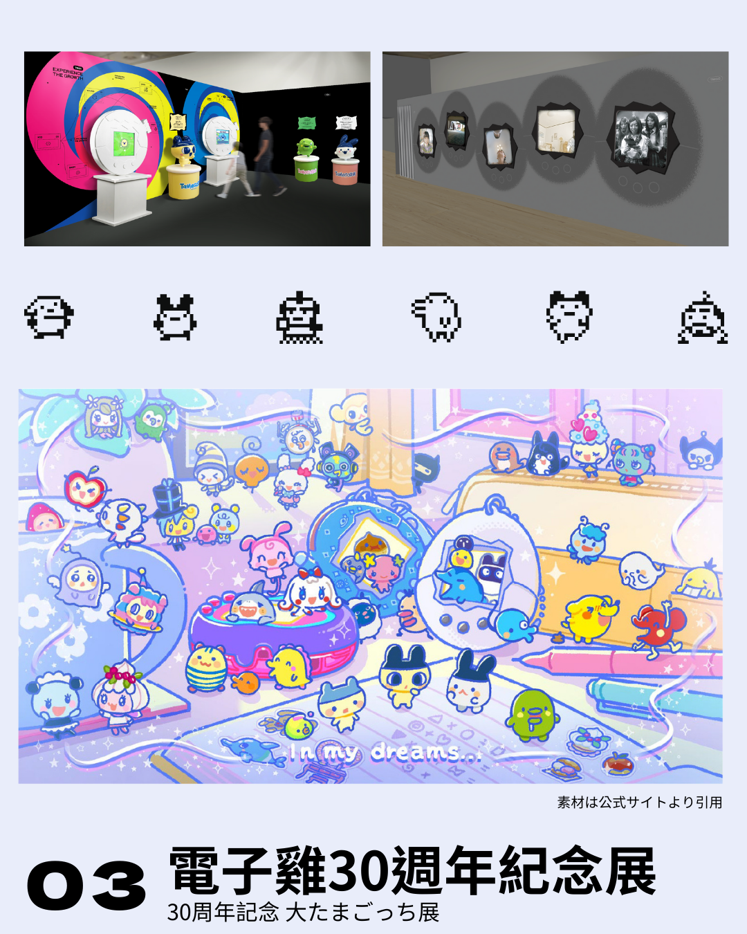 90年代の大ブームから最新機種まで、たまごっち30年の進化を体感。液晶の中に入り込むような展示空間で、キャラクターの暮らしや開発秘話を楽しみながら、世代を超えた思い出がよみがえります。