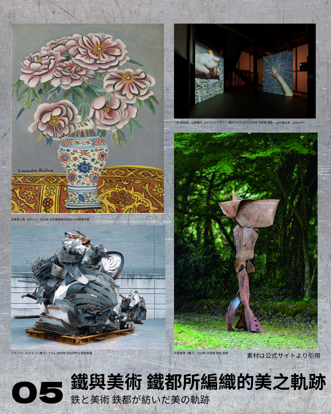 製鉄の街として発展した北九州。その歴史と記憶を、美術作品を通して見つめ直します。日本製鉄所蔵作品や鉄鋼彫刻資料、新作展示から、工業と芸術が交差する都市文化の魅力を再発見。