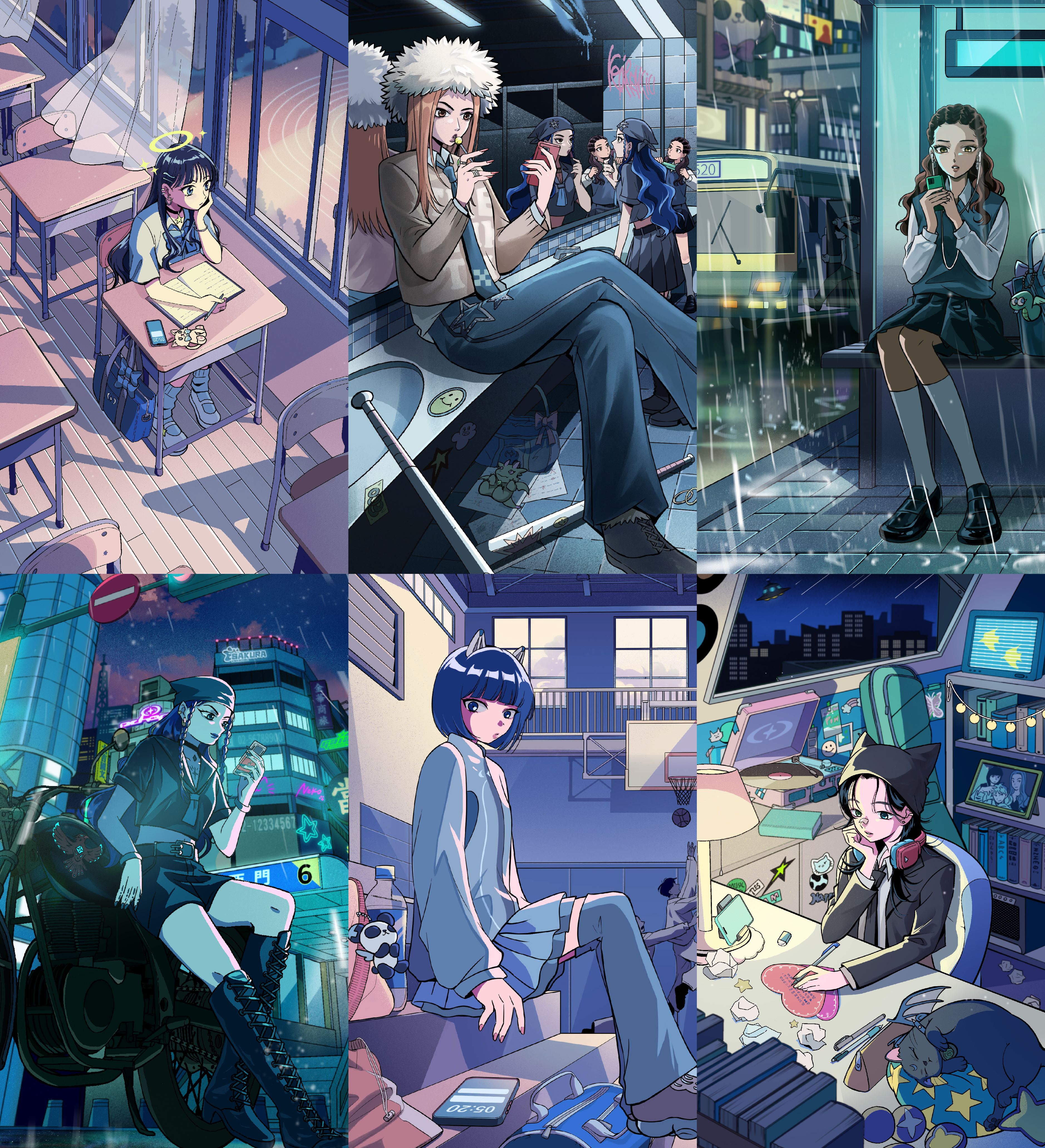 像是 Sabrina胡恂舞望著窗外偷瞄暗戀的男生在操場打鬧;Karencici 放學前跟姐妹在廁所補妝,準備去西門探索新世界;JACE陳凱詠分手後獨自一人的在下著雨的公車站;阿布絲ABUS 在霓虹感的夜晚騎著車享受自由的風;aiai等待籃球隊長男友練球的甜甜滋味;Andr 在房間裡的異想天開,這個空間裡有過去有未來,整個想像填充了整個空間。
