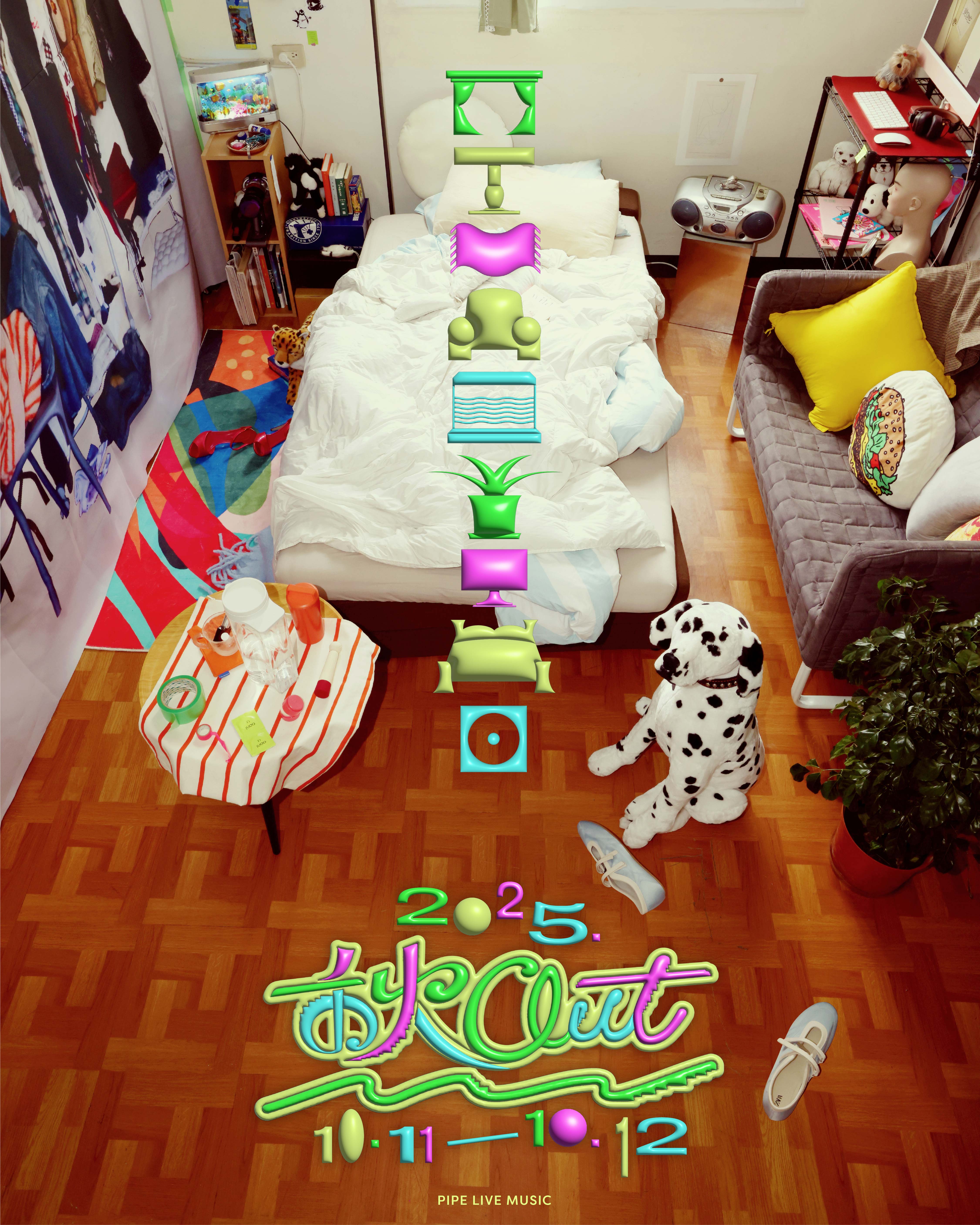 由PIPE Live Music舉辦的「秋OUT音樂節」從2018年開始舉辦,獨有的Chill氛圍帶來舒爽自在搖擺的現場演出,場域橫跨交通便利的公館商圈,輕鬆簡短的步行距離即可漫遊各大舞台;即使遇上下雨,水泥地場域也不會讓樂迷陷入泥濘,依舊保有舒適看團體驗,成為台北樂迷心中「最舒服、最Chill、最便利」的音樂祭之一,近年成為台北南區最具指標性的音樂活動,樂迷參與人數也逐年成長。迎接第六屆的秋OUT音樂節,確定在今年雙十連假登場,日前公開活動主視覺,以「要不要來我房間聽音樂」作為主題,希望把臥室裡的隨性浪漫,搬到舞台現場。