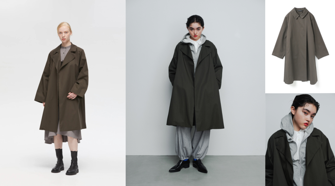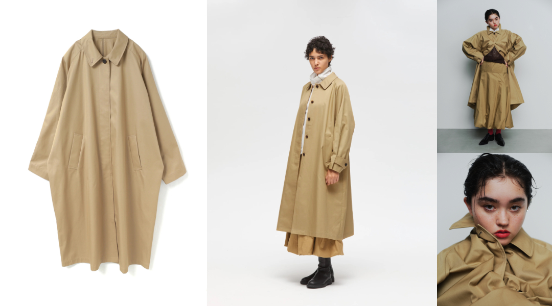 以經典風衣為基礎,極力簡化裝飾元素,適合日常多元搭配。材質選用挺度適中的棉質斜紋布。設計上,帶有工裝與軍裝感的設計語彙,運用圓弧造型的領片增添柔和的女性氣息,透過自然向外延展的傘狀剪裁,營造出俐落線條、帶有空氣感的穿搭風格。