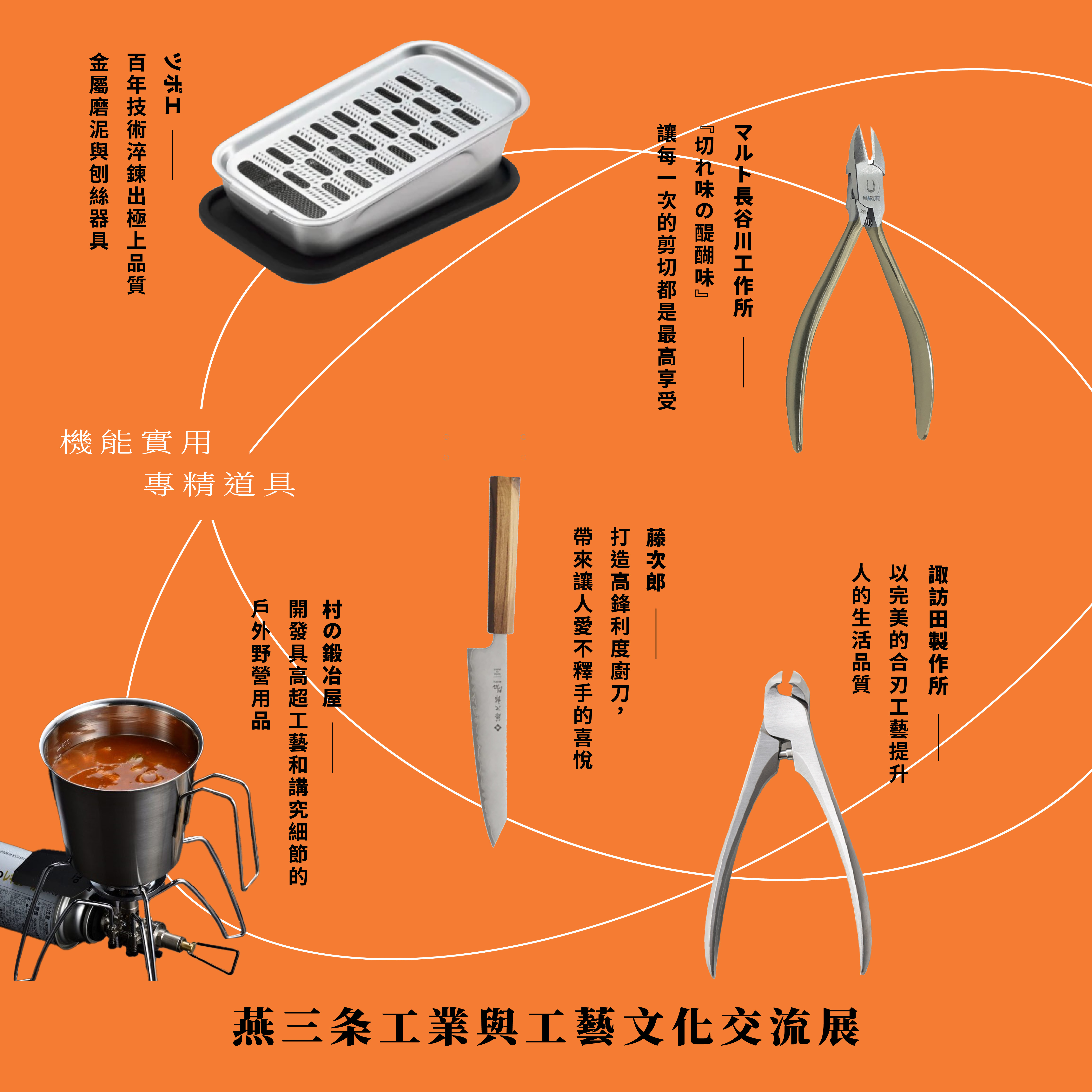 將工業材料推進成美學材料、把金屬加工轉化為生活工藝、使技術轉譯為設計語言,是位於日本新潟縣的燕三条被世界認識的樣貌。由日本的「燕三条貿易振興会」偕台灣的「德貿股份有限公司」、「囍樹設計」、「鈑研所」共同策動,透過展覽、講座、工坊、選物販售,小食市集等精彩企劃,除了帶領大眾從職人注魂的創作裡,感受生活、藝術、土地在其中的深厚連結,也經由實際拿在手裡使用,無論是敲打、切割或削磨,去看到「每一件工具都是一個世界」。
