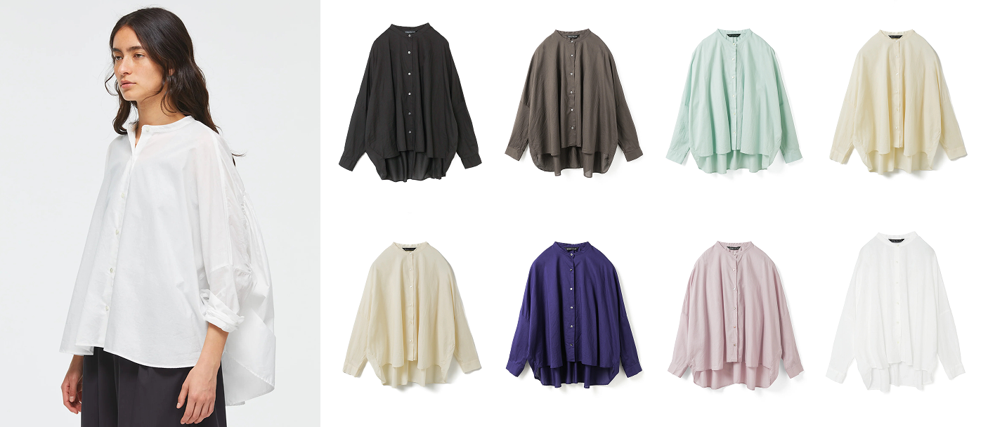 mizuiro ind 經典且高人氣的代表作,展現立體輪廓與隨性自在的慵懶魅力。設計細節上,正面採用俐落的立領設計呈現清爽簡約風格,背面加入寬幅細緻的摺邊;前短後長的圓弧下擺、落肩設計,適合各種身型。搭配上,俐落合身的褲裝、或具份量感的裙裝都十分適合。材質特別選用具透視感的輕盈棉質薄紗,在夏季可作為遮陽外罩,冬季則可改為內搭疊穿。此襯衫是整年度皆能自由穿搭的品牌長青單品,共推出超過10款色系。