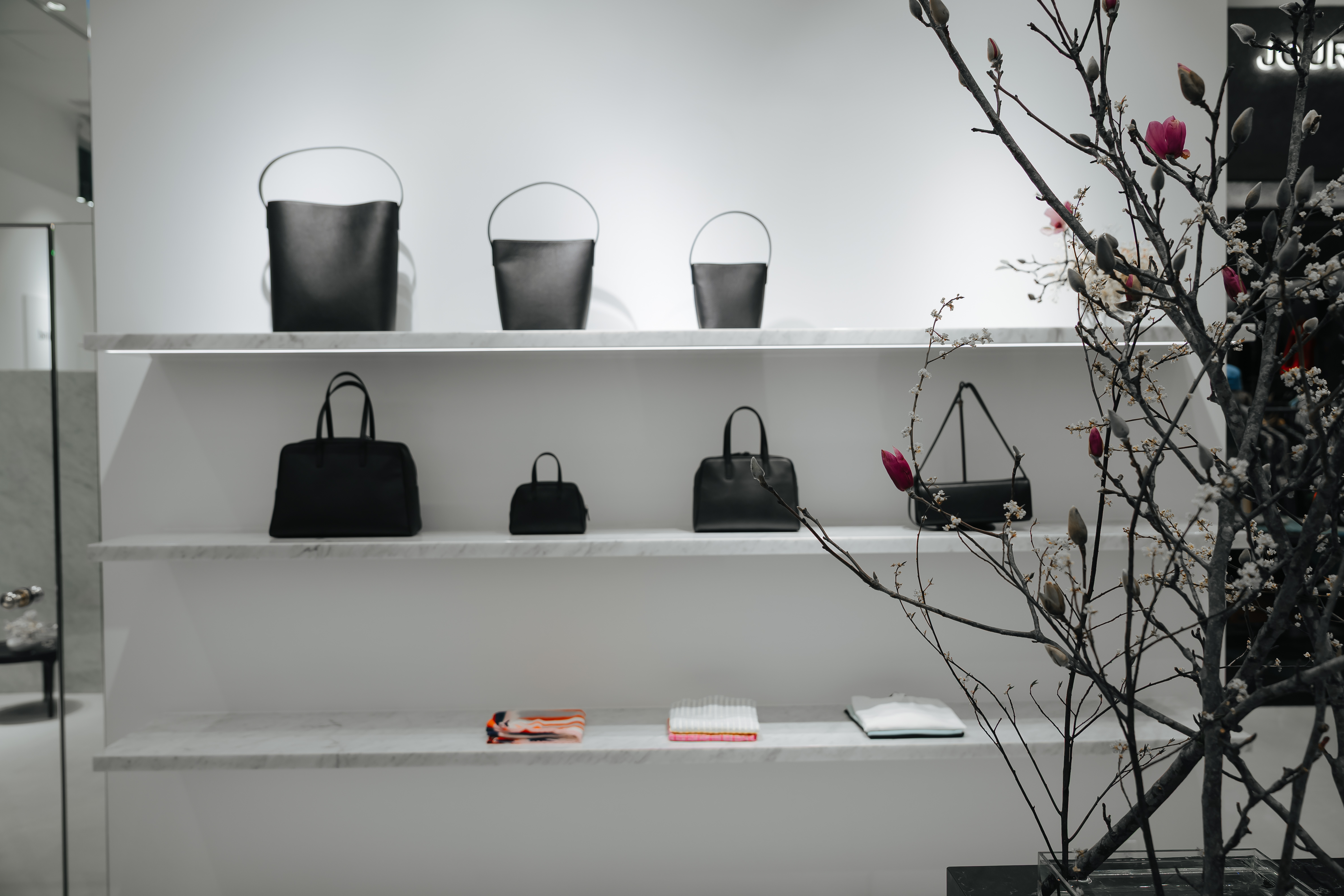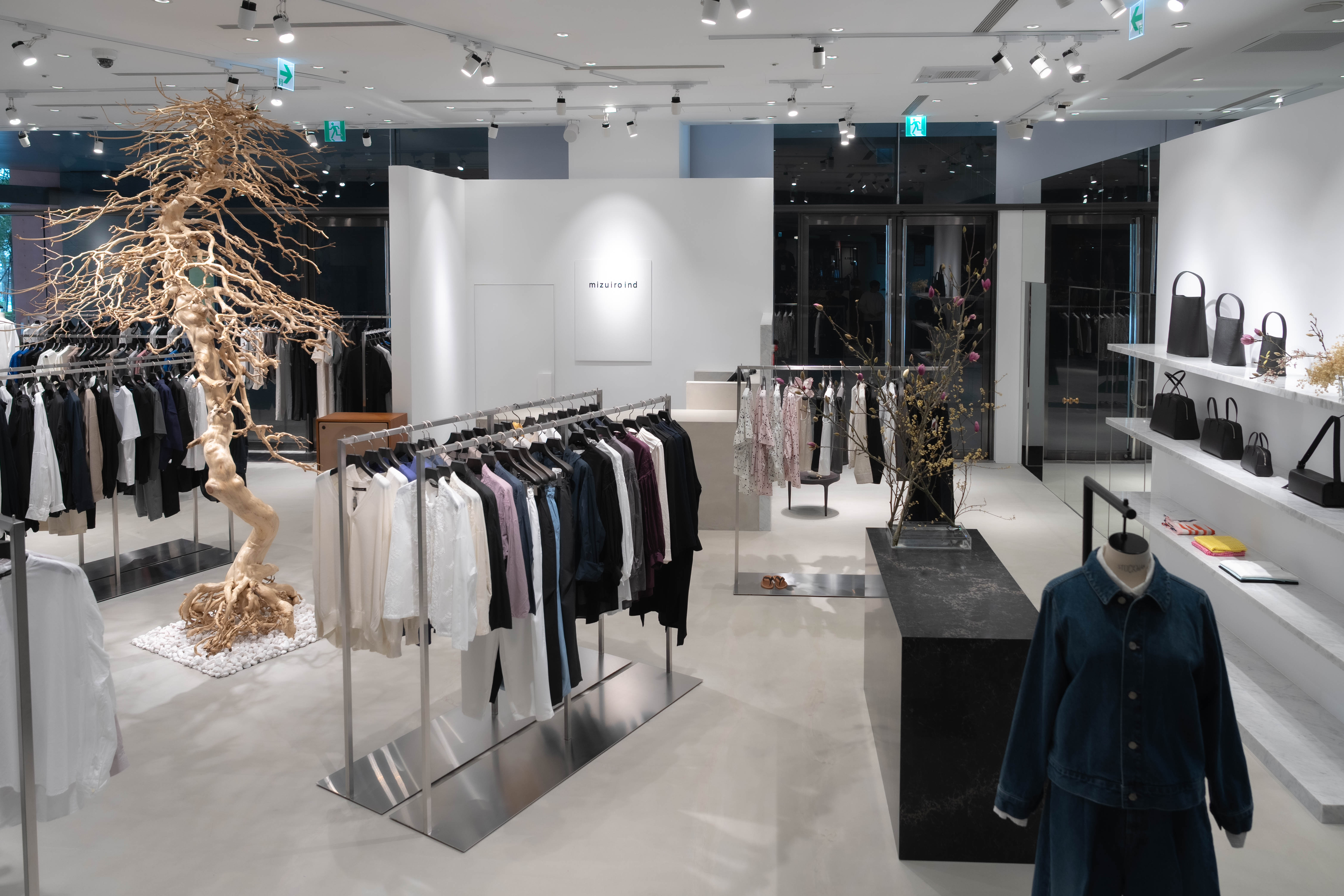 本次首間旗艦店落腳台北誠品松菸,以近40坪的大面積,打造舒適穿衣體驗。整體設計以日式無機質風格為主,中間以日本藝術家西畠靖和打造的松樹枯枝藝術呈現侘寂的美感;陳設也以大理石檯面、復古傢俱、灰階地板呈現極簡、清爽與現代感。