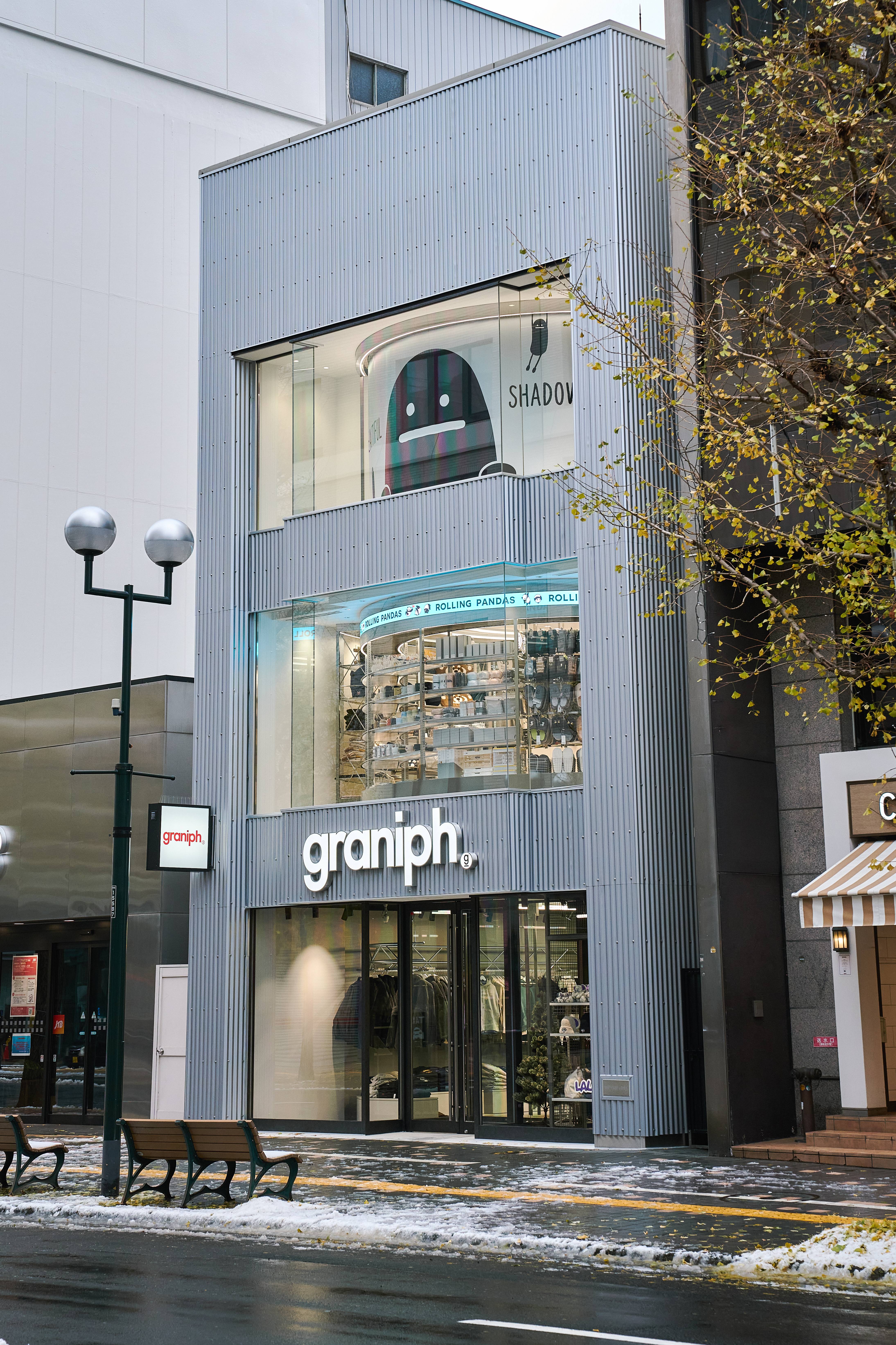 目前 graniph 在日本國內擁有超過 70 間門市,並於東京原宿、福岡、札幌設有超過百坪的大型旗艦店,提供最完整的穿搭選擇與生活雜貨。其中位於東京原宿與福岡市中心的旗艦店更設有品牌咖啡廳,提供IP的印花拿鐵與各式甜點。