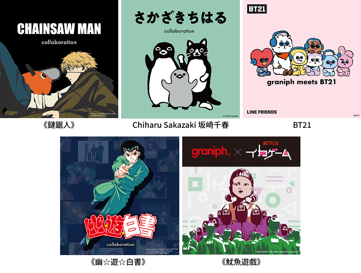 graniph 過去也曾經和許多人氣IP聯名,包含動漫、藝術家、影視作品等日本海內外的知名IP,每年合作的IP數量約為40種,贏得廣大粉絲群,包含《進擊的巨人》、《JOJO 的奇妙冒險》、《鏈鋸人》、《BT21》、《麥當勞》、《新世紀福音戰士》等。品牌也與國際影視作品跨界合作,包含 Netflix 熱門影集《魷魚遊戲》與《怪奇物語》等系列。